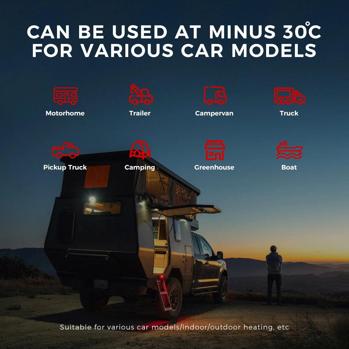 【APPLICATION SCENARIO】Our air heater can be used at high altitudes up to about 3000 meters sea level. Whether at high altitude or in cold temperatures, this portable diesel heater campers will provide you with constant warmth, preheat your vehicle, keep the interior warm, preheat the engine, and prevent windows from freezing. Perfect for heating the cabs of cargo trucks, vans, battery trucks and a variety of other vehicles.