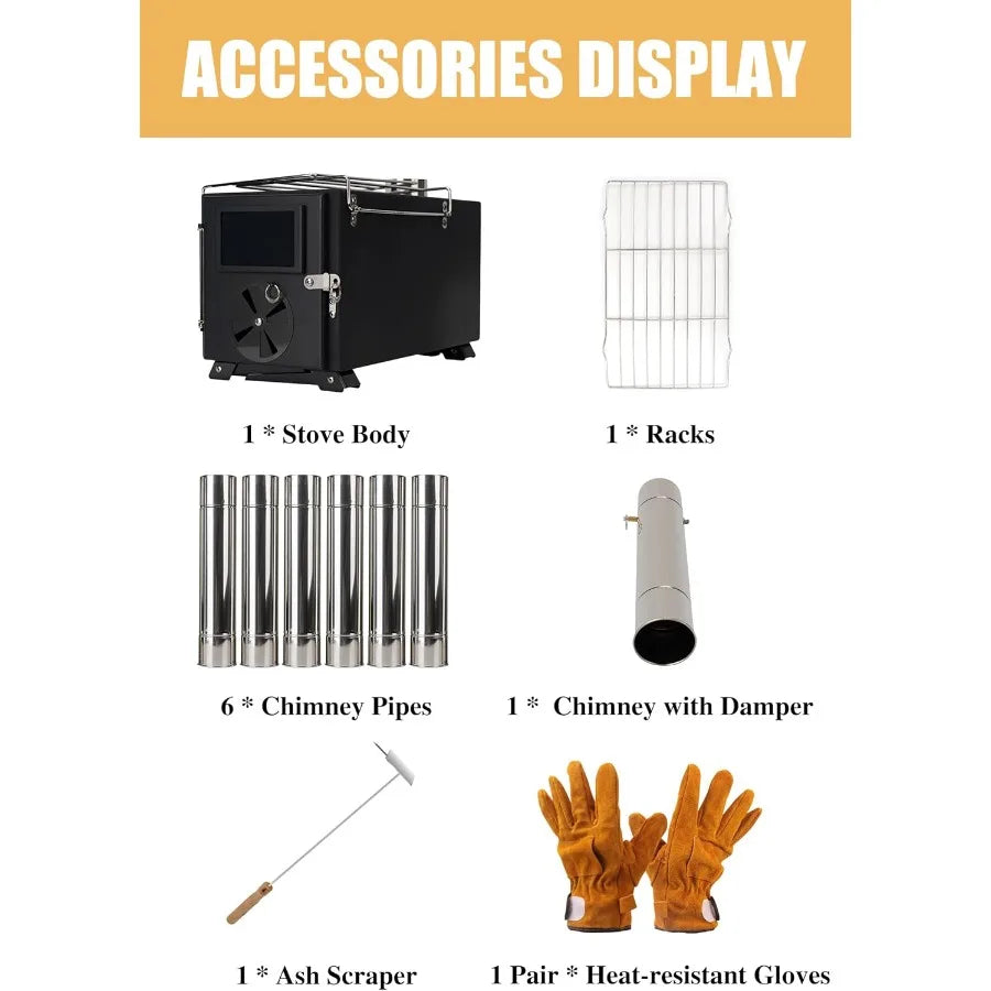 - Portable design — foldable legs tuck flat under the stove; folding side racks expand workspace and double as carry aids; chimney tube stores inside for compact transport.