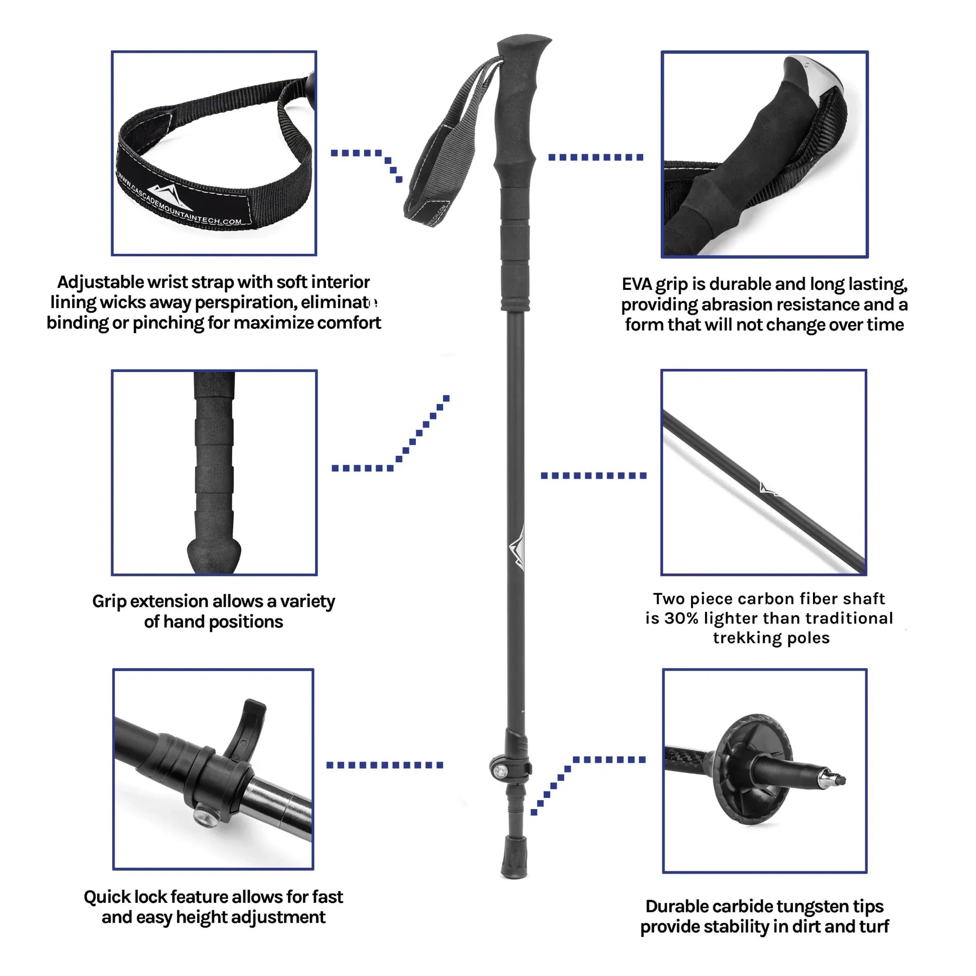 Ultralight 2-Section Carbon Fiber Quick Lock Black Trekking Poles are perfect for every outdoor enthusiast. They are ideal for backpacking, hiking, and walking uphill, downhill and on flat terrain. This pair of adjustable trekking poles is made from just two sections, 100% carbon fiber, and EVA grip. These features provide the ultralight weight, 30% less than traditional carbon fiber poles at 5.6 oz per pole. The "quick lock" mechanism allows for easy height adjustment when in use. These trekking poles will not slow you down on the trail. Instead, they will improve your hiking endurance and allow you to reach new heights. See what kind of difference they can make; order yours today!